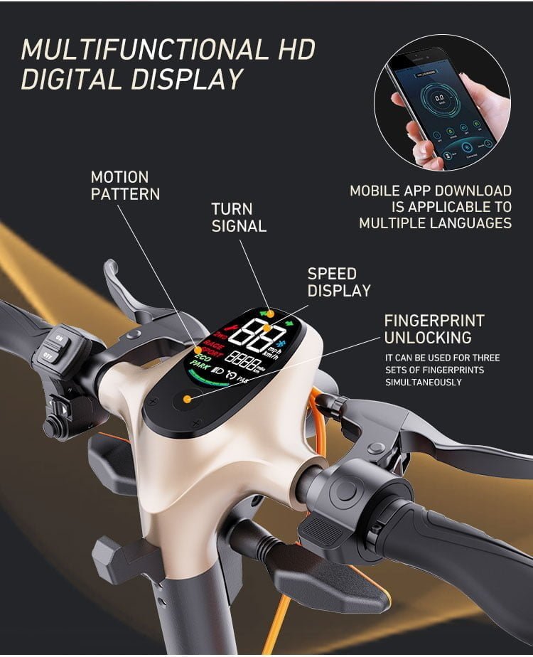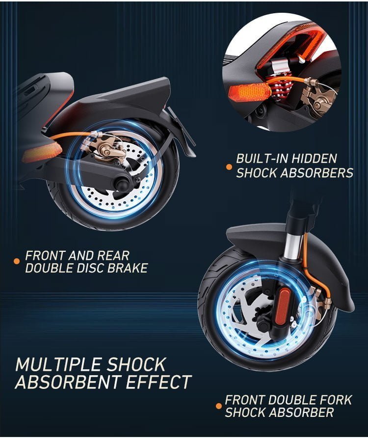10 inch off-road electric scooter with luxurious seats and a luggage compartment at the back of the seat, which is very convenient for disassembly and assembly. It supports different tires and can be driven on different roads, highways, mountains, paddles, beaches, etc. It is equipped with a front and rear oil brake system, which is very safe, with front and rear shock absorption, and very comfortable driving. It also has a large display screen, on which all data can be displayed, Especially at night, supporting different colors of lights. There are also headlights, with a range of 20-50 meters. The rear tail lights are compatible with brake lights, turn signals, and side lights, greatly improving safety. The extra advantage is that the driving distance is about 20-30km, and the maximum speed can reach 40km/h. It is easy to carry and can be quickly folded and placed in the trunk, It’s also the best tool for traveling